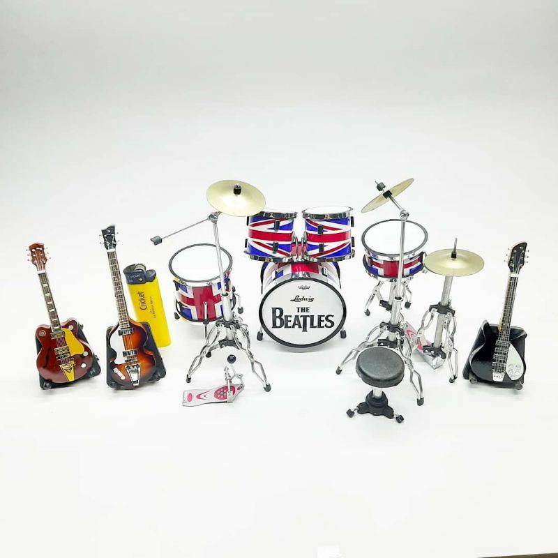 miniatur drum set the beatles UK FLAG+ gitar miniatur alat musik hiasan rak dinding pajangan 1 : 12