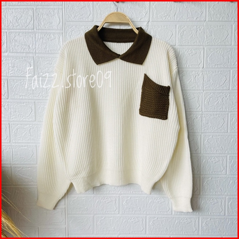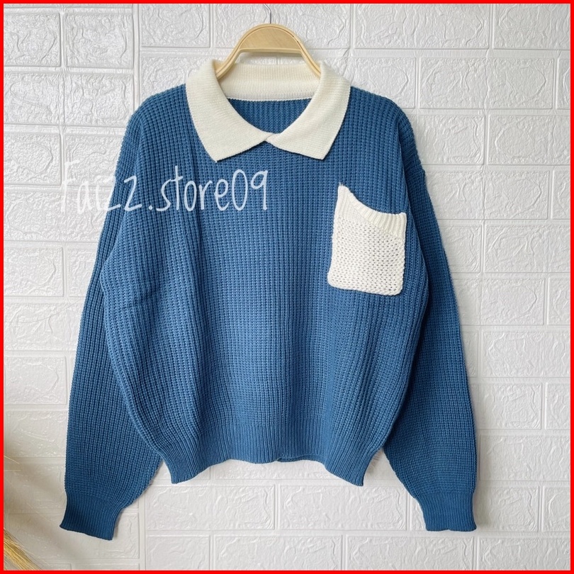 Erato Polo Knits Sweater Rajut Crop Oversize Atasan Rajut Wanita Kerah Lengan Panjang