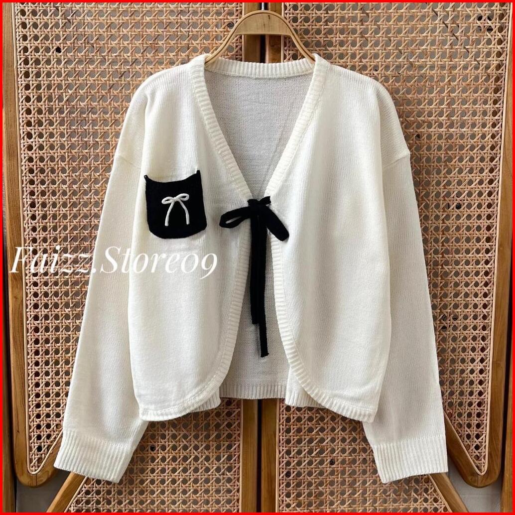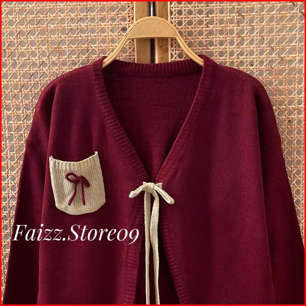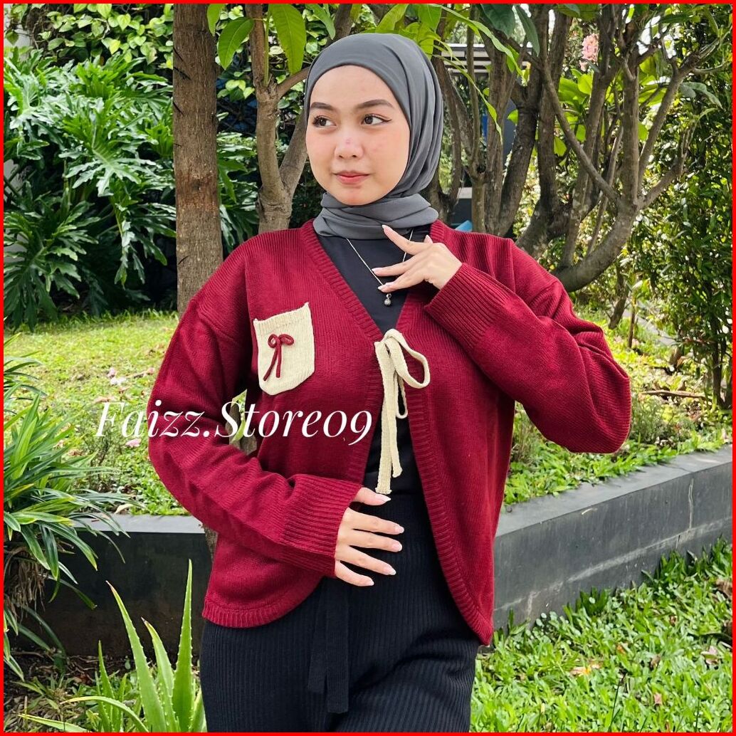 Rista Outfit Cardigan Crop Saku Motif Tali Pita Atasan Rajut Wanita Outer Simple Premium Terbaru Korean Style