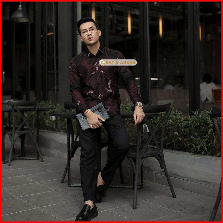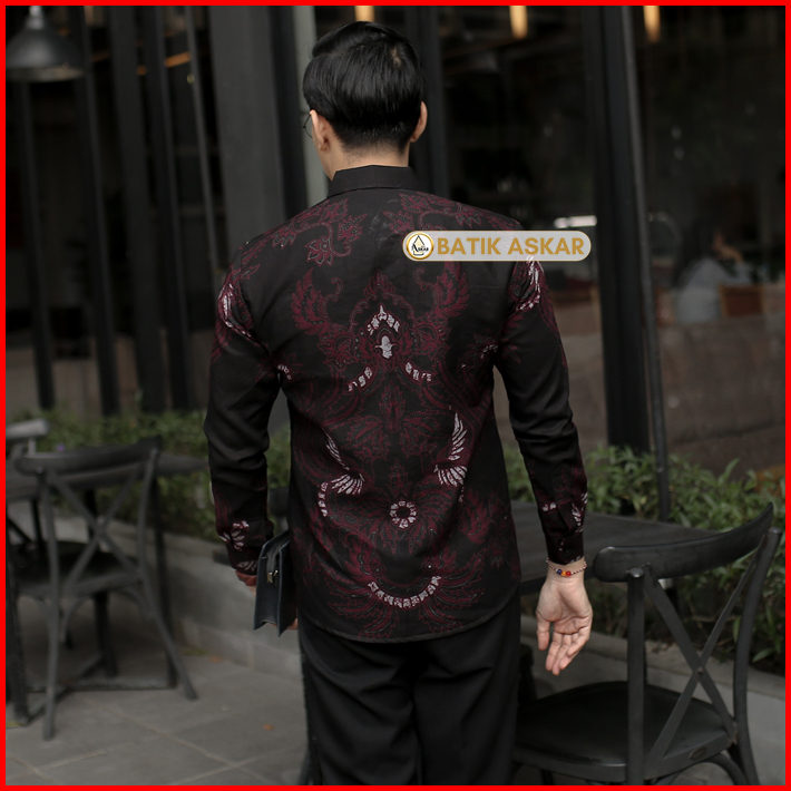 Askar Batik Motif Mahapatih Baju Kemeja Batik Pria Slimfit Lengan Panjang Elegant Modern Heem Premium Warna Hitam Merah