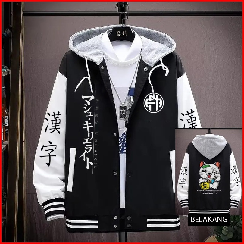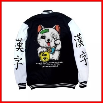 Best Seller - Jaket Varsity Hoodie Kombinasi Kucing Neko Premium Tebal Jaket Baseball Distro Quality Pria Wanita Vintage