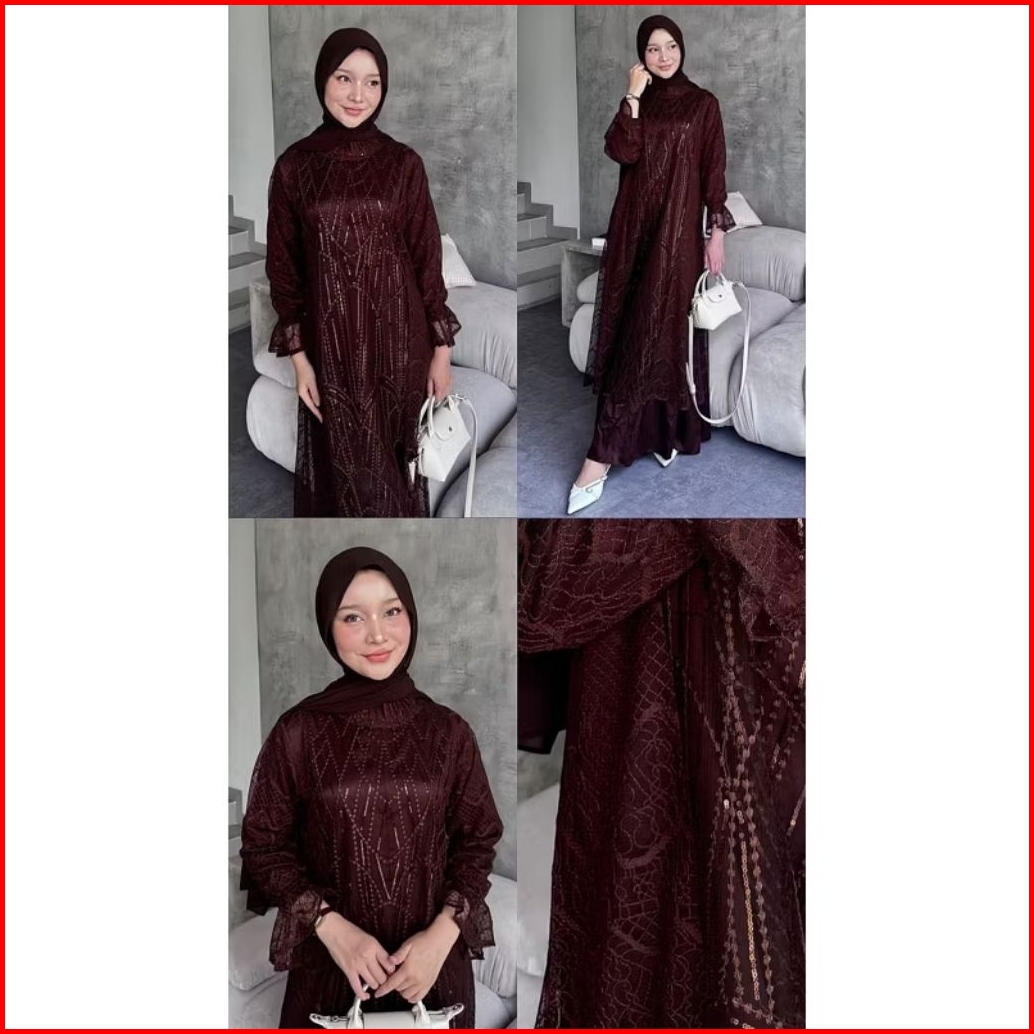 Dress Feysa Inner Outer Elegan Lebaran Kondangan L Xl Xxl Premium Jumbo Mewah Gamis Muslim Produk Terbaru Mahogani Mahog