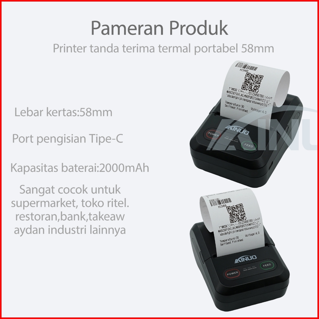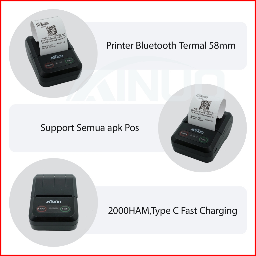 Ainuo Printer Thermal Kasir 58mm Printer Thermal Struk Mini Portable Bluetooth Typec Android Windows