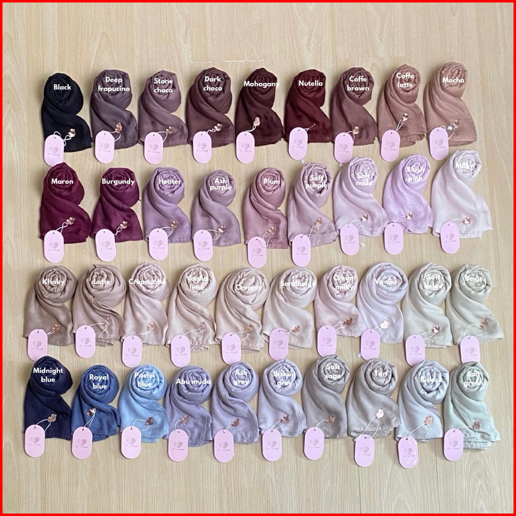 Biscuit Grey, Vanila, Biscuit, Soft beige, Beige, Tan, Milky, Sandbeige, Cream Milky, Creamlatte, Creamy, Latte, Pastel Blue, Khaky, Blush pink, Soft Nude, Burgundy, Maroon, Ash Purple, Soft Purple, Coffe Brown, Mahogany, Stone Choco, Black, Deep Frapucino, Dark Choco, Nutela, Soft Sage, Midnigt Blue, Royal Blue, Abu Muda, Ash Grey, Plum, Heater, Salt green, Vanila Latte, Mocha, Coffe Latte