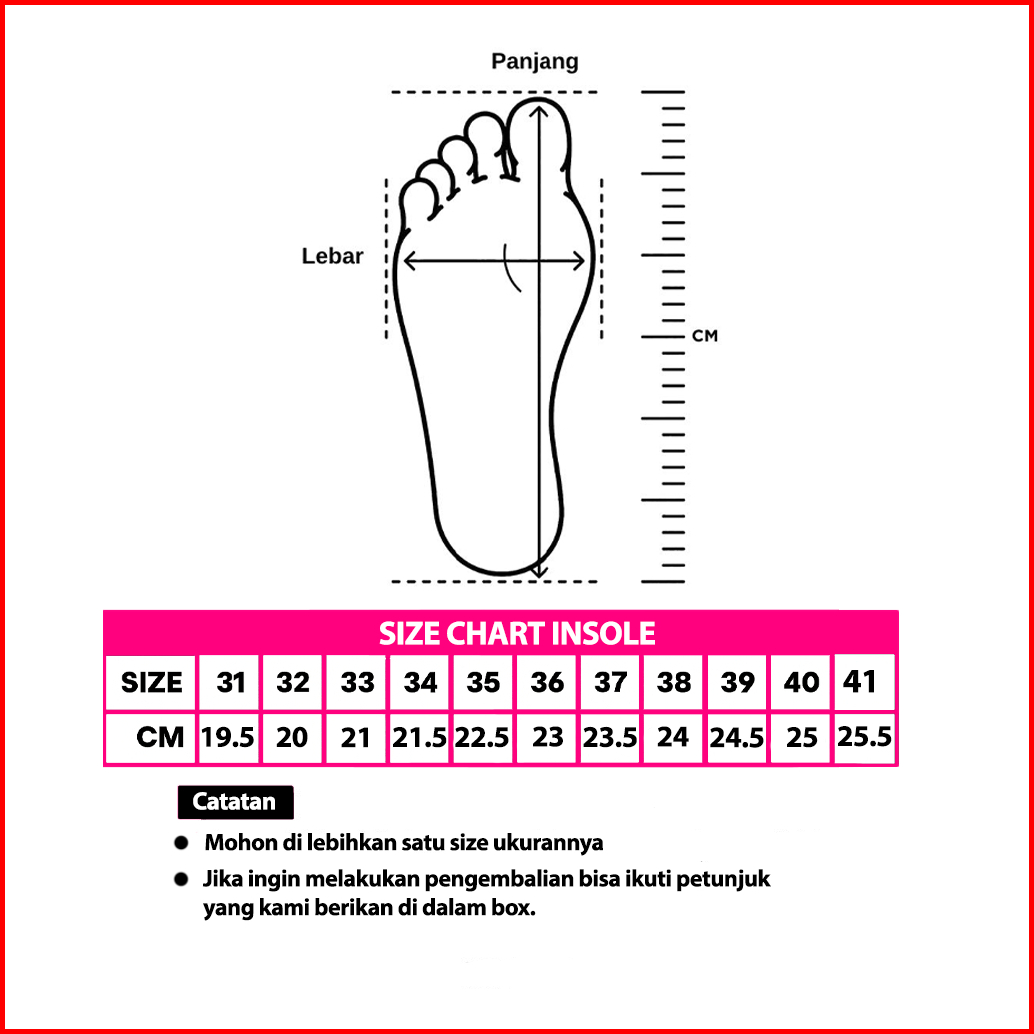 31 : 19.5cm, 32 : 20cm, 33 : 21cm, 34 : 21,5cm, 35 : 22,5cm, 36 : 23cm, 37 : 23,5cm, 38: 24cm, 39 : 24,5cm, 40 : 25cm, 41 : 25,5cm
