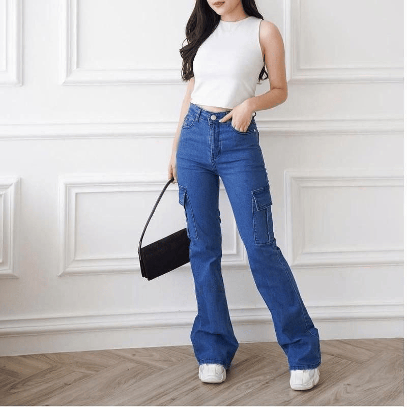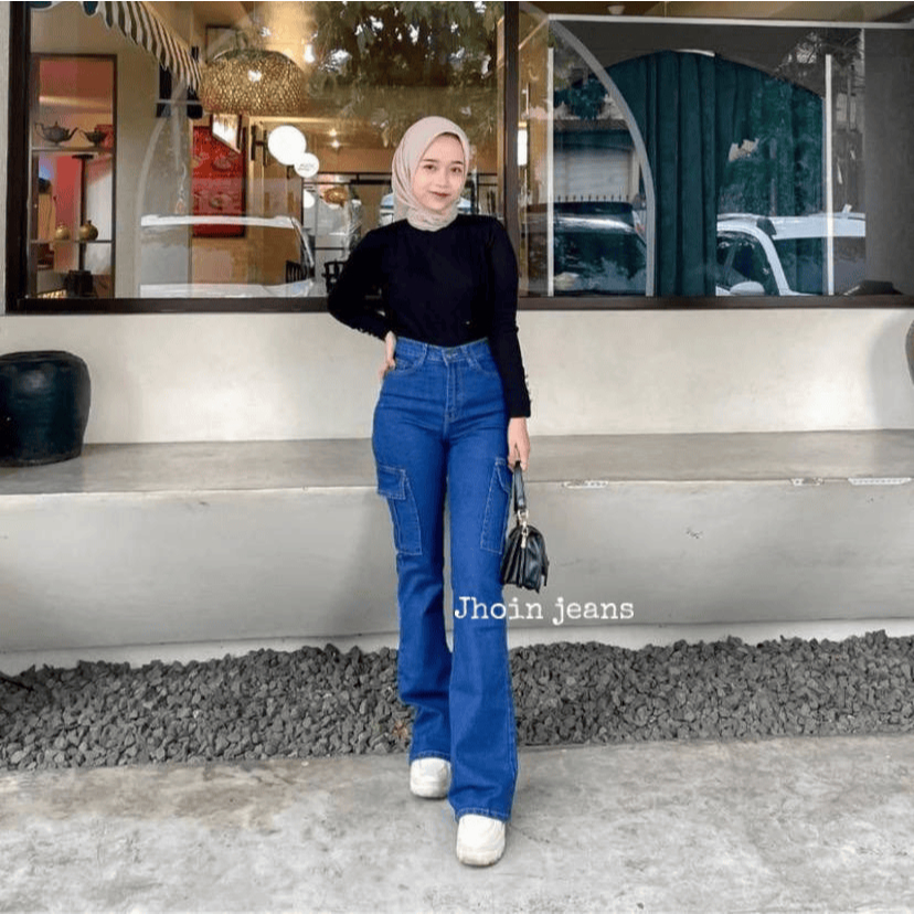 Jhoin Fashion - Celana Jeans Wanita Cargo Cutbray Highwaist Stretch Melar