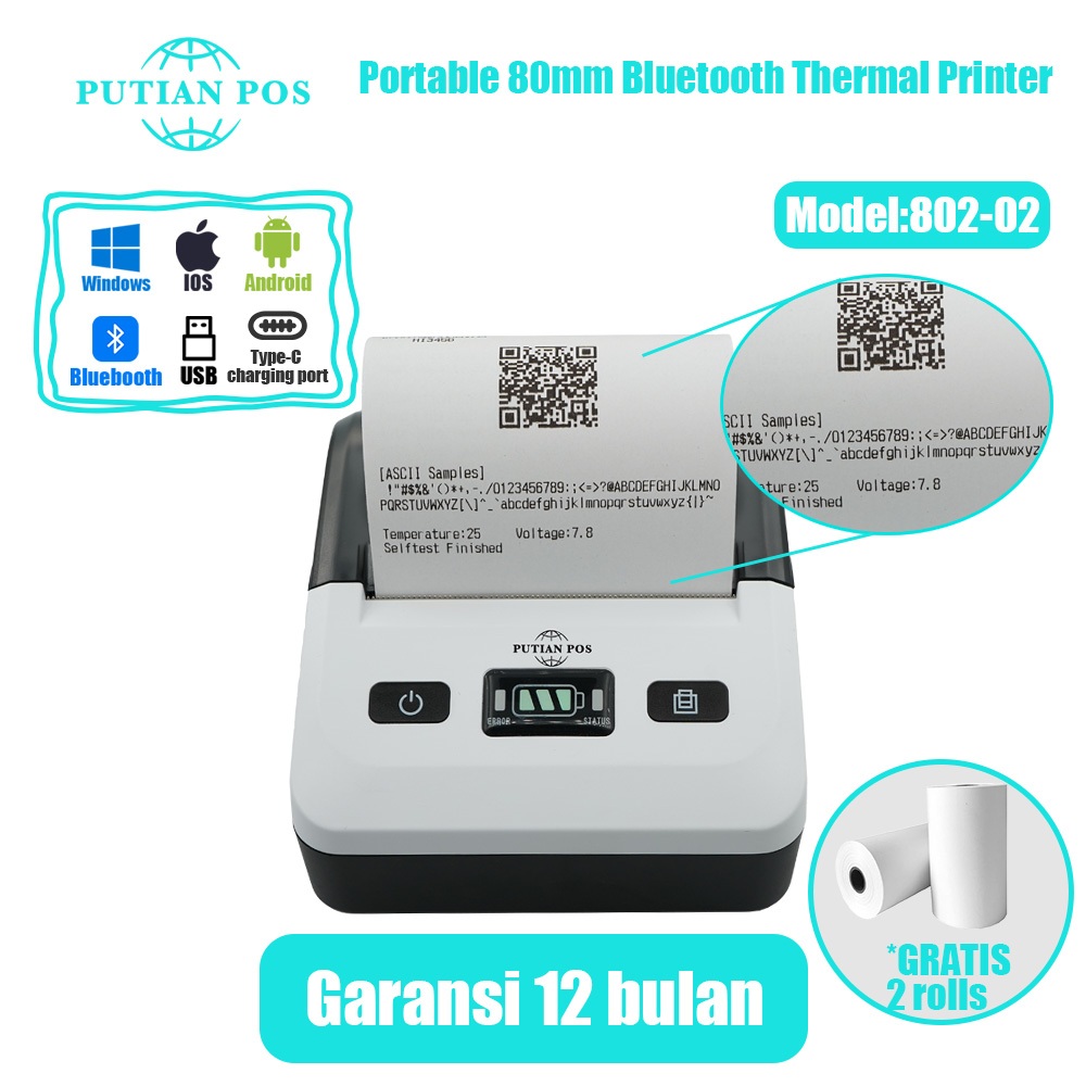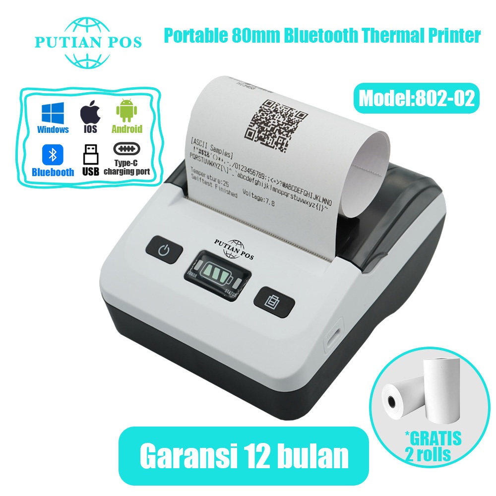 Printer Termal Bluetooth Portabel PUTIAN POS 80mm 802-02 untuk Toko Online (Dengan Baterai)