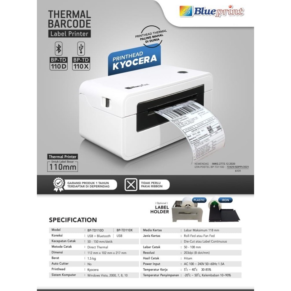 Printer Bare Thermal/Label Resi A6 BLUEPRINT TD110D USB+Bluetooth