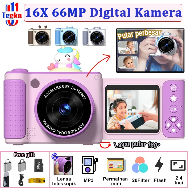 TEEKA [S6] 66MP Digital Camera Anak Flip Kamera Digital 1080P 16X Digital Zoom Dengan Dukungan Selfie Koneksi untuk Hadiah Pemula【Dengan Kartu 64GB】