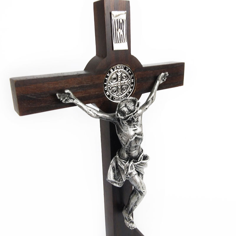 Salib Duduk Meja Kayu Medali Benedictus Courpus Patung Rohani Tubuh Yesus INRI glass 30 cm