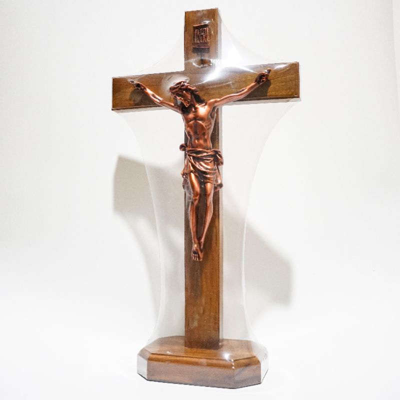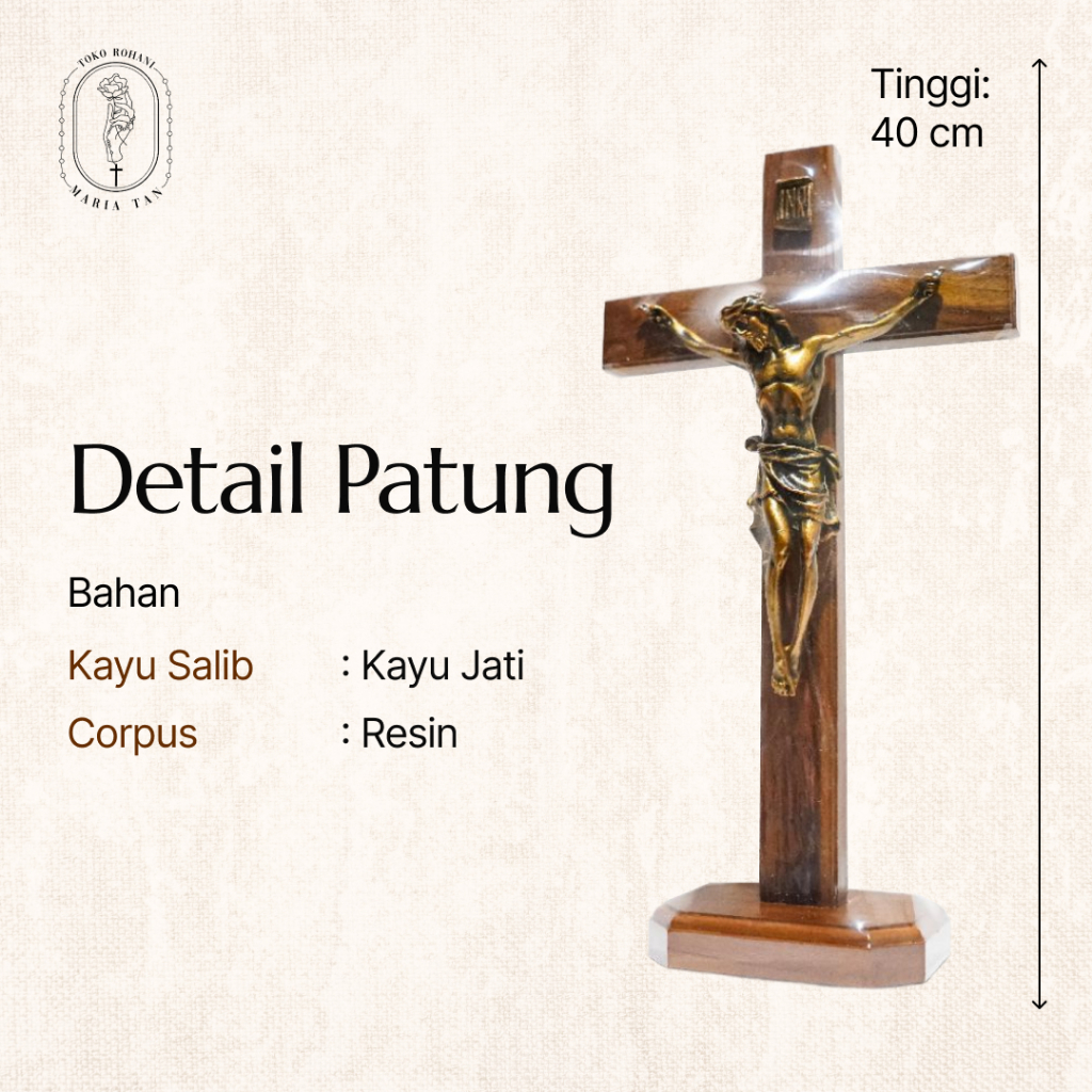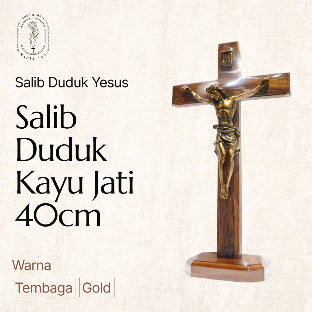 Salib Duduk Katolik Kayu Jati 40 cm (Tembaga/kuningan mengkilap) - Salib Meja - Salib Rohani - Salib Patung Yesus