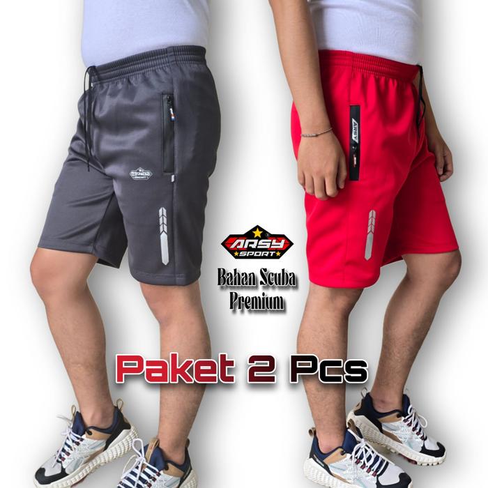ARSY SPORT - PAKET 2 PCS - CELANA RUNNING PRIA WANITA SHORT PANT GYM SC003 - BAHAN SCUBA ELASTIC ADEM NYAMAN - KOLOR - HITAM & ABU TUA, M