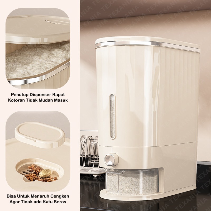 TEXANIA DISPENSER BERAS OTOMATIS 10KG TEMPAT PENYIMPANAN BERAS FOOD GRADE ANTI KUTU DAN SERANGGA