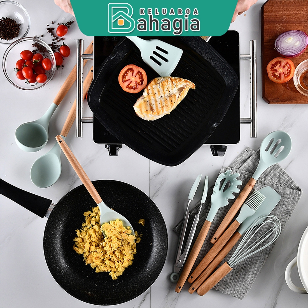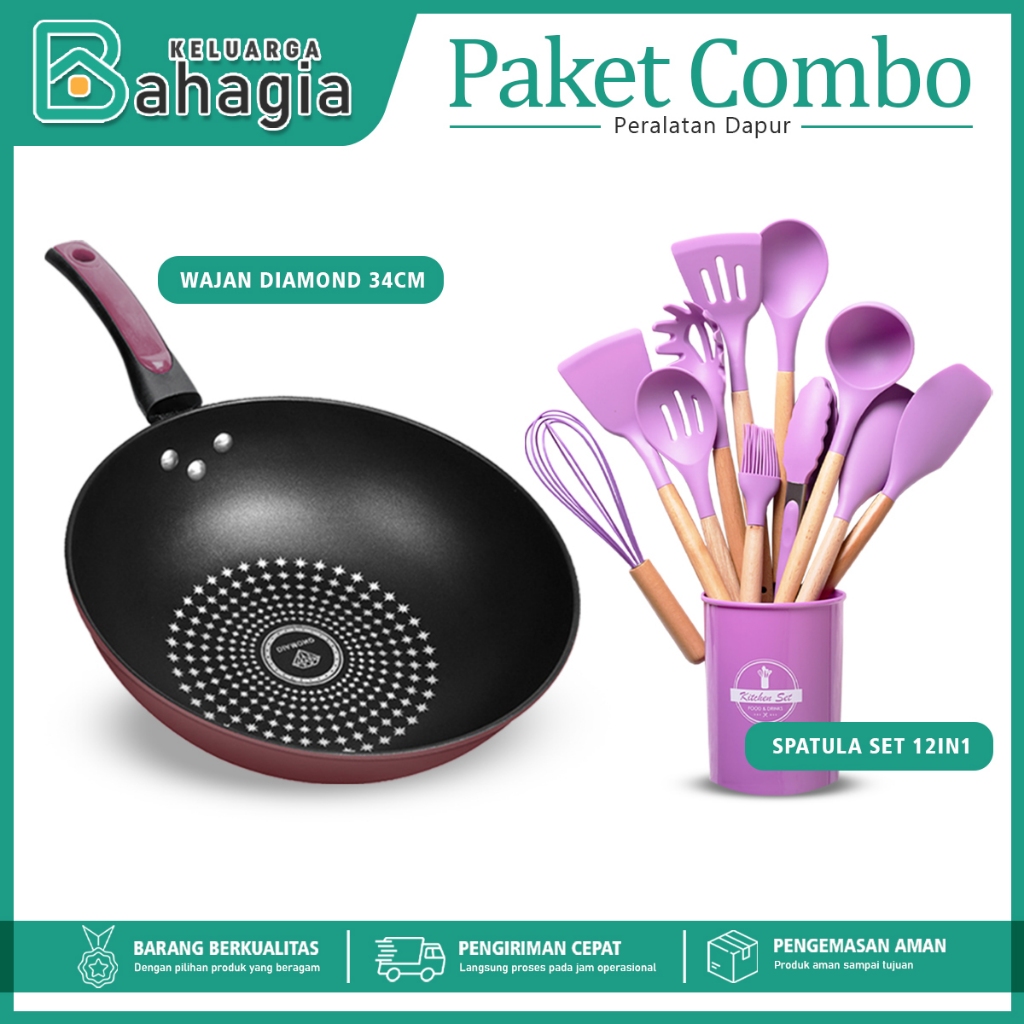 KBPAKET COMBO SPESIAL WAJAN DIAM0ND 34CM + SPATULA SILICONE SET 11PCS PEGANGAN KAYU & WADAH
