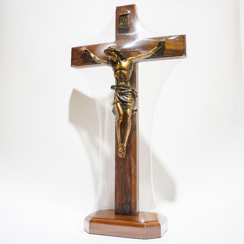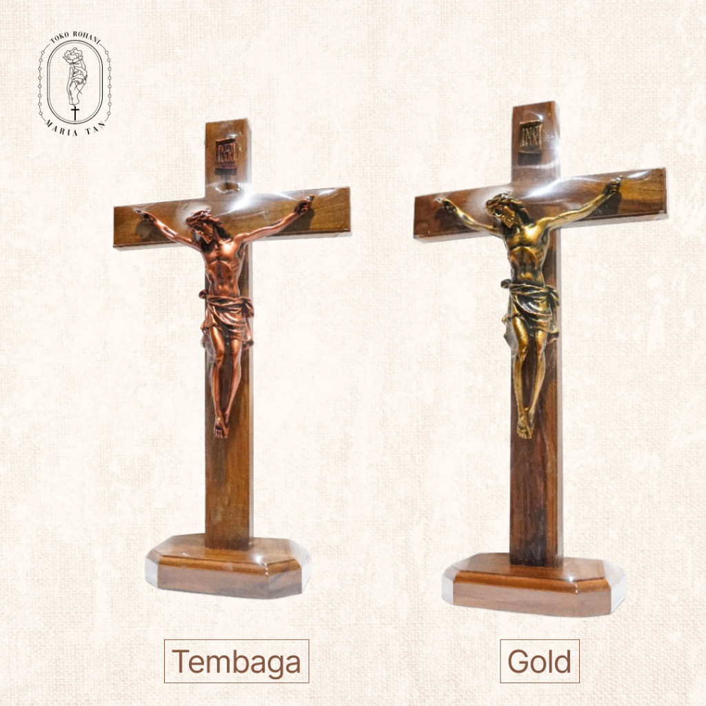 Salib Duduk Katolik Kayu Jati 40 cm (Tembaga/kuningan mengkilap) - Salib Meja - Salib Rohani - Salib Patung Yesus