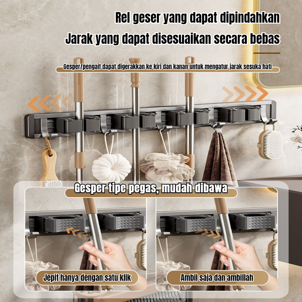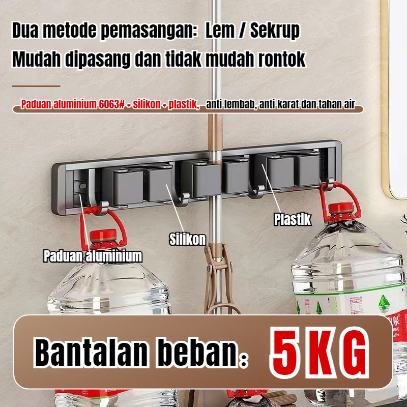 Gantungan Sapu Alat Pel Penjepit Gantungan Dinding Mop Holder Tempel Paduan Aluminium Dengan Hook Multifungsi