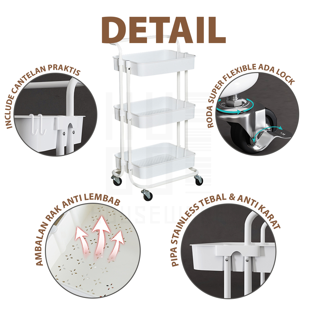 HUGO Rak Troli Susun Rak Dapur Serbaguna Rak Kamar Mandi Rak Salon Rak Penyimpanan Multifungsi dengan Roda dan Pegangan