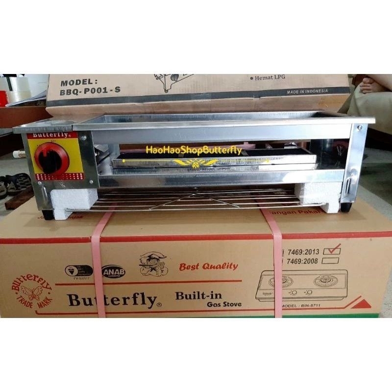 Panggangan Sosis / Kompor Panggang Gas / Grill Sosis, Sate, Ayam BBQ merk Butterfly P001 + Rak Meja 70 Cm