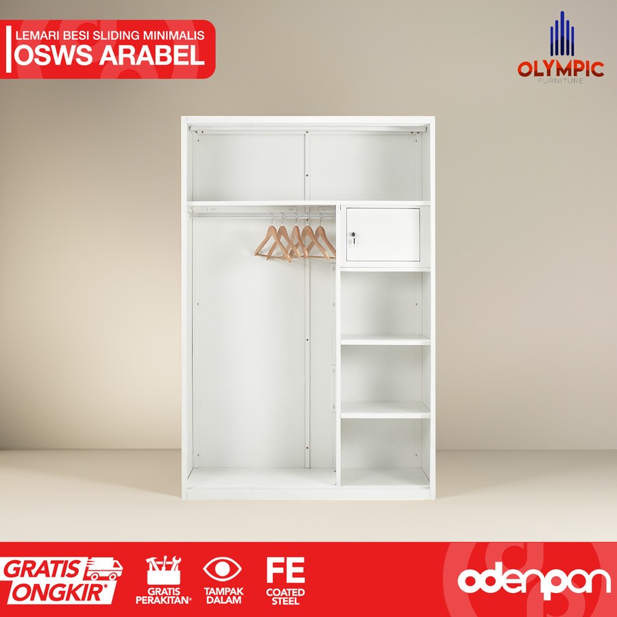 OLYMPIC OSWS ARABEL Lemari Pakaian Baju 2 Pintu Besi Sliding Putih Minimalis Dengan Cermin & Motif Kayu