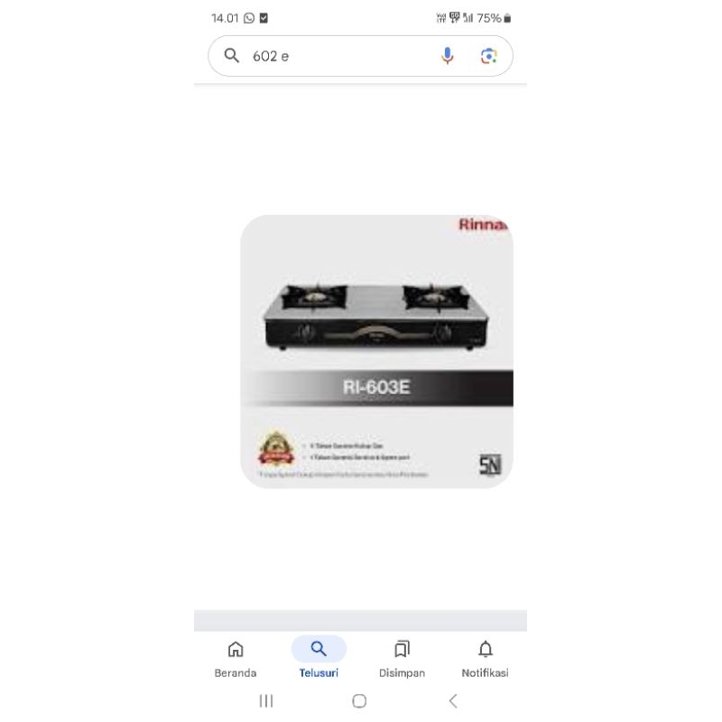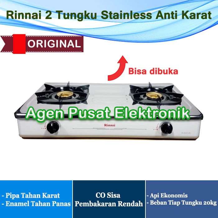 Kompor Gas Rinnai RI-602E W 2 Tungku RI 602 E Stainless Steel Api Ekonomis LPG RI 602 E/602w Putih