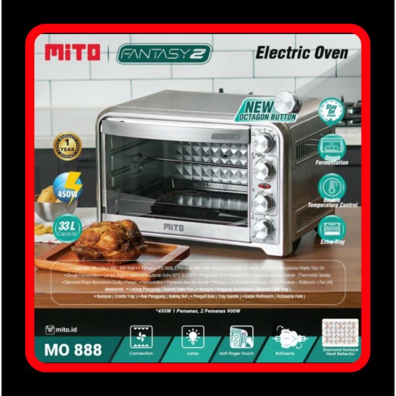 Oven Mito Fantasi 2 MO 888, 33 liter New Octagon Button Oven Listrik Low Watt