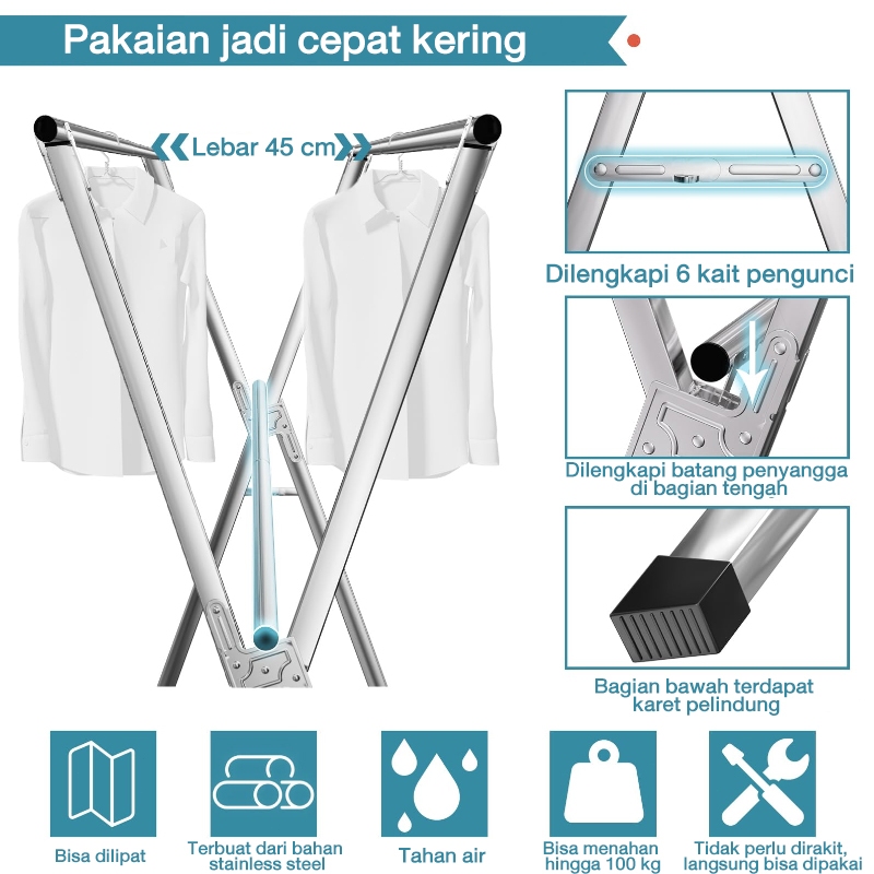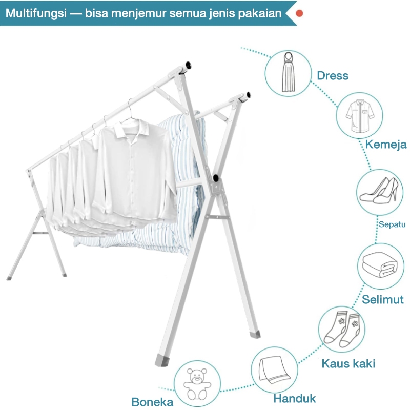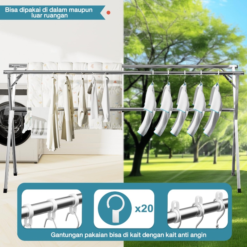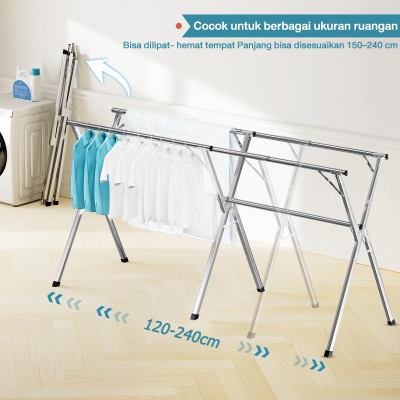 Jemuran baju stainless steel 2.4M Lipat Jemuran Baju Portable Anti Karat Tidak Diperlukan Instalasi