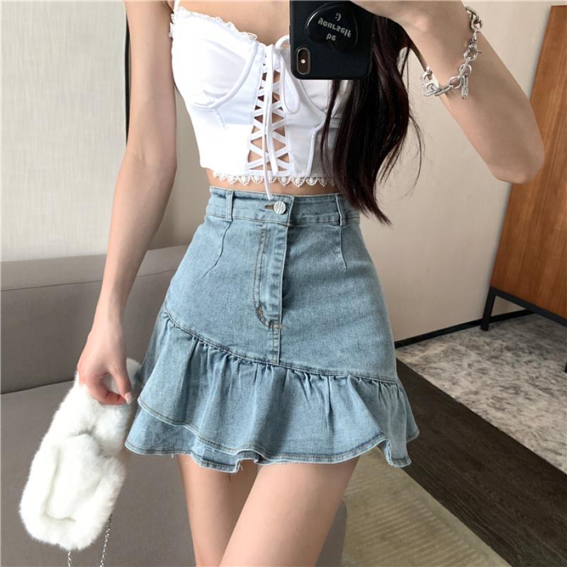 YURUMA Falbala High Waist Spice Girls Denim Rok Pendek Rok Lipit Wanita Rok A-line Aman dan Serbaguna