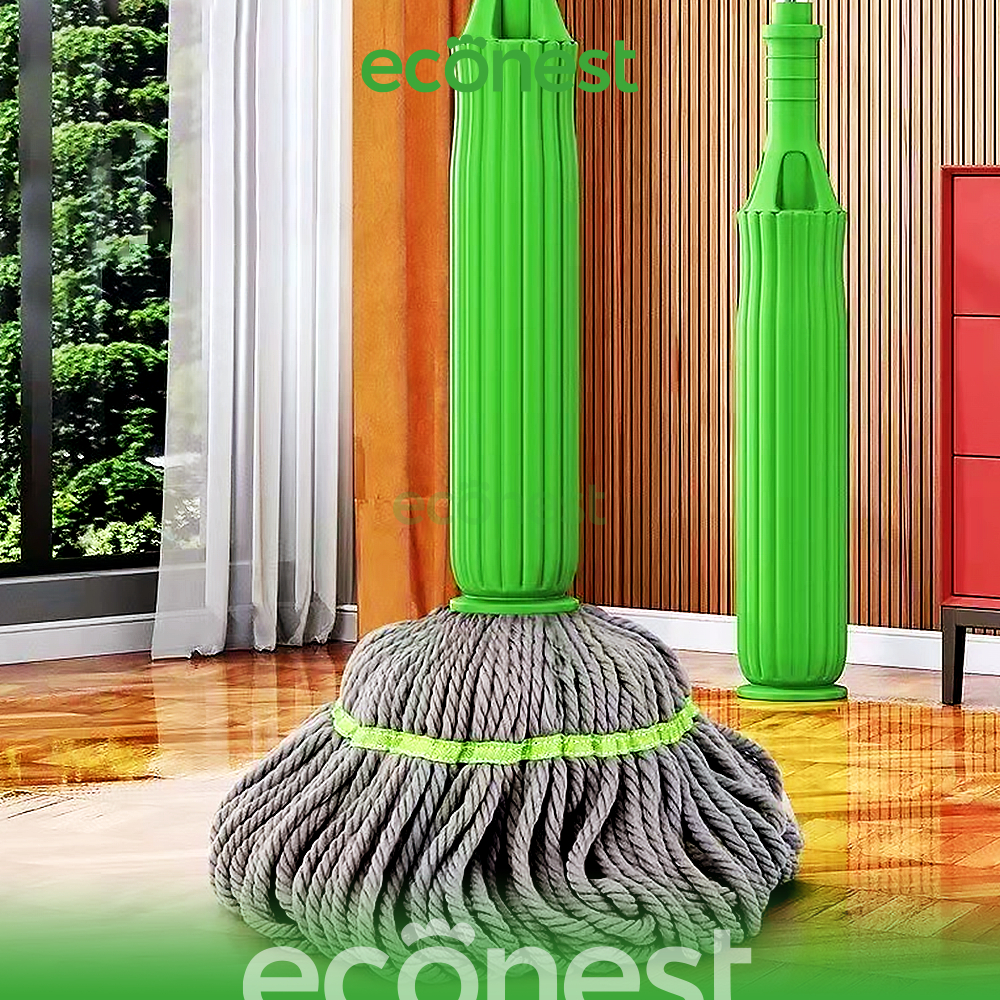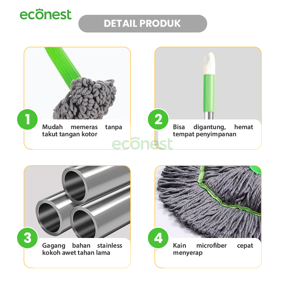 Econest Alat Pel Lantai Twist Mop Kain Pel Microfiber Tarik Peras Otomatis Gagang Stainless Premium