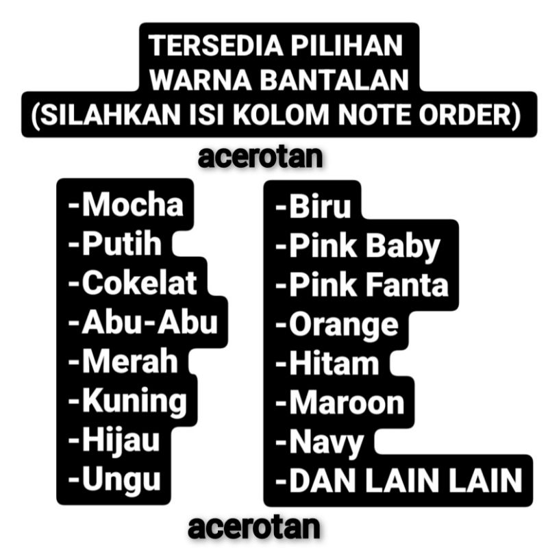 COKELAT, PUTIH, MOCHA, CREAM, MERAH, HIJAU, UNGU, KUNING, PINK, HITAM