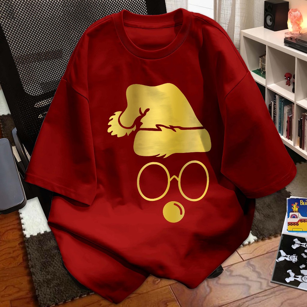 LYKKE Kaos Natal T-shirt Baju Kaos Merry Christmas I Santa Claus Hat Siluet kuningan mengkilap I Atasan Distro Xmas Rohani Seragam Couple Keluarga Natal 2025 Atasan Katun A6416