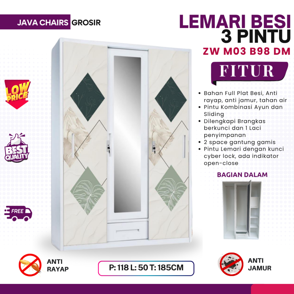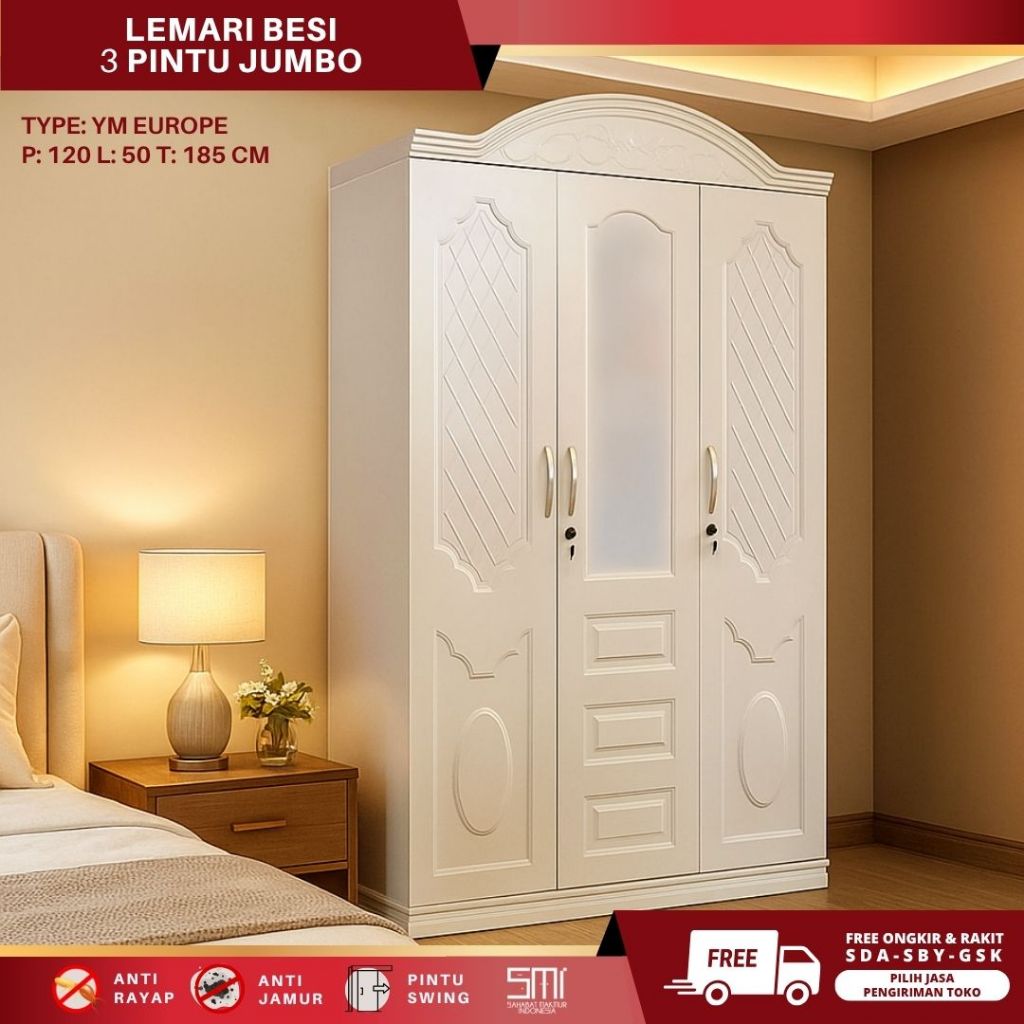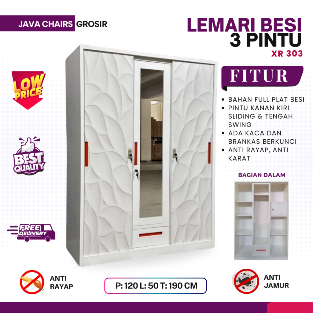 Lemari Pakaian Besi 3 Pintu Sliding Swing 120cm – Lemari Baju Anti Rayap & Tahan Lama