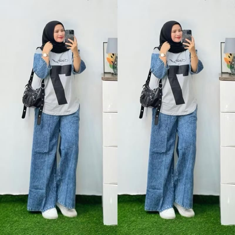 Setelan Jeans XL,XXL Wanita Dewasa Atasan Combed 24s Celana Jeans Kulot Cargo, Setelan Wanita Kekinian
