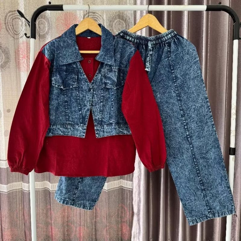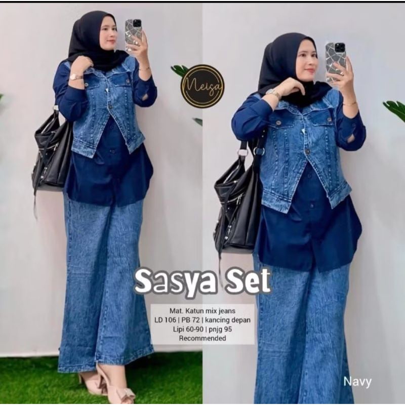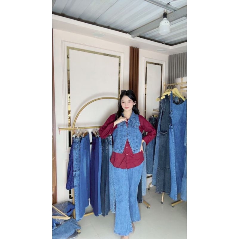 Alexa Set (set soraya) Setelan kemeja jeans dan celana cutbray, kemeja jeans kombinasi bahan jeans muslim wanita kekinian Korean style