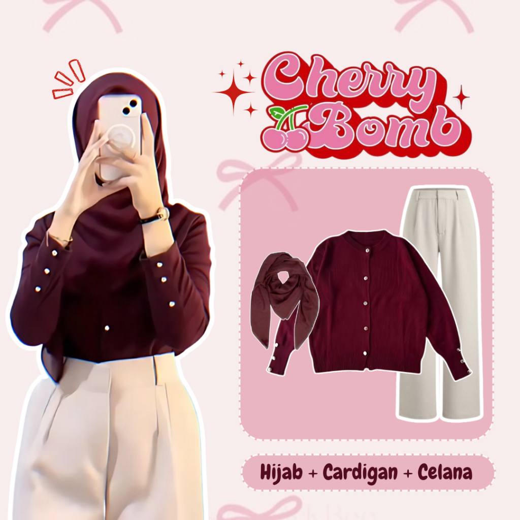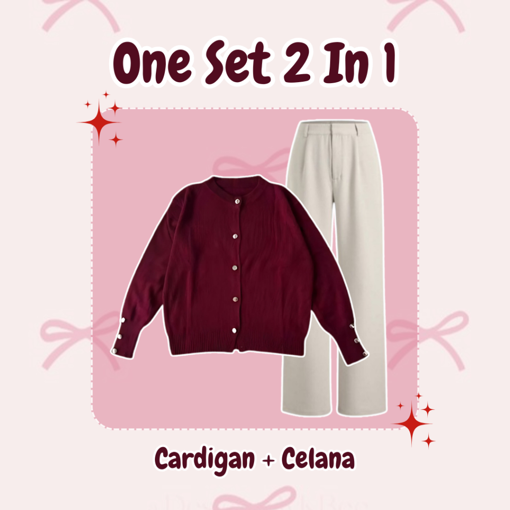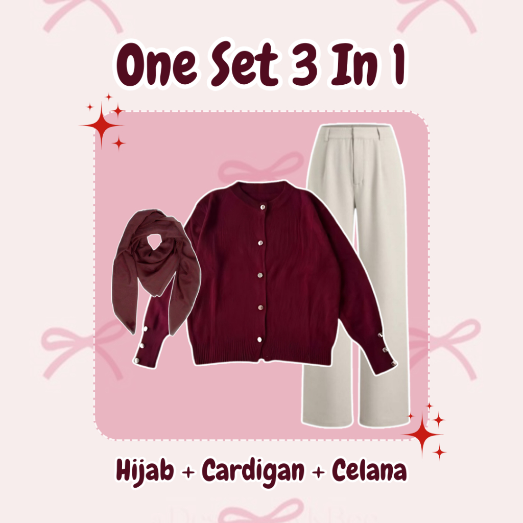 One Set Wanita Setelan Kekinian (Cardigan Rajut + Celana Knit + Hijab) OOTD Feminine Girl - DS082 N