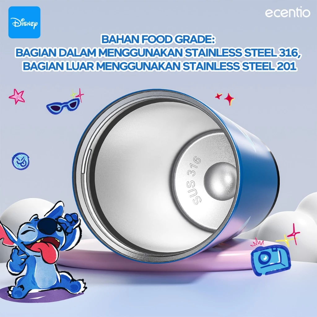 Ecentio Disney Stitch Premium Botol Minum Stainless Sus 316 Tahan Panas dan Dingin 530ml portable