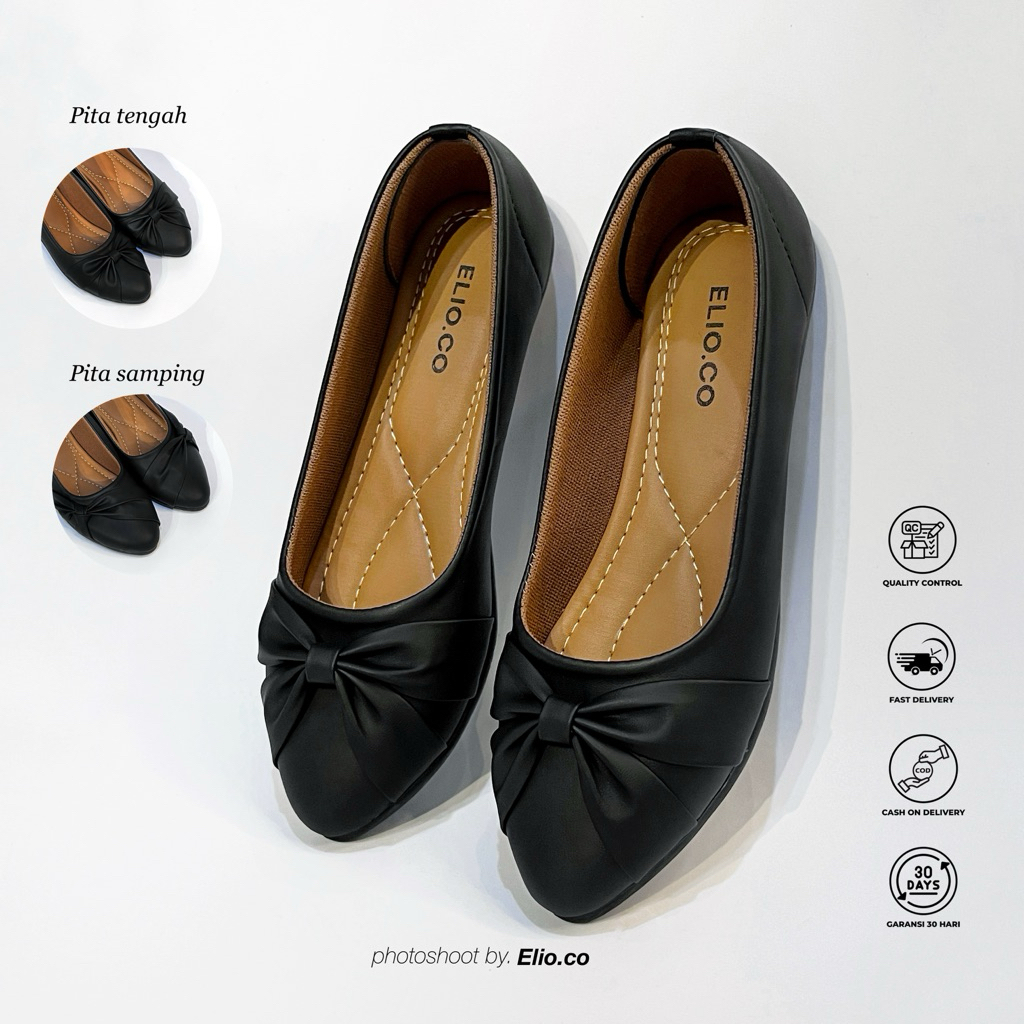 ELIO-Black pita samping & pita tengah flatshoes elegan best seller