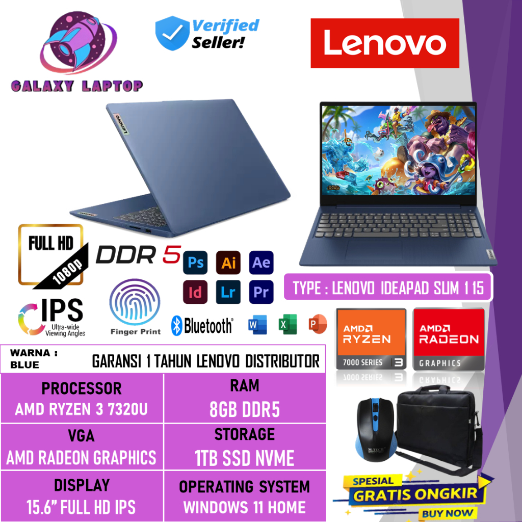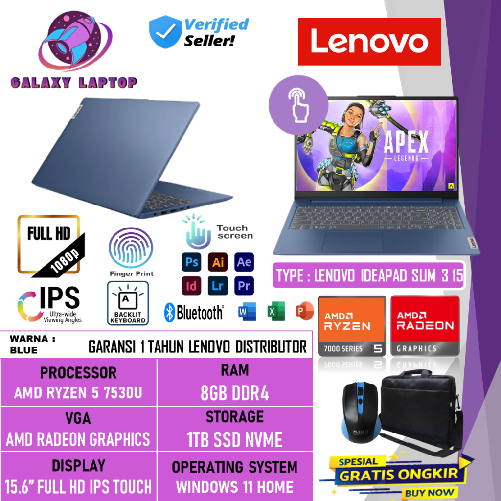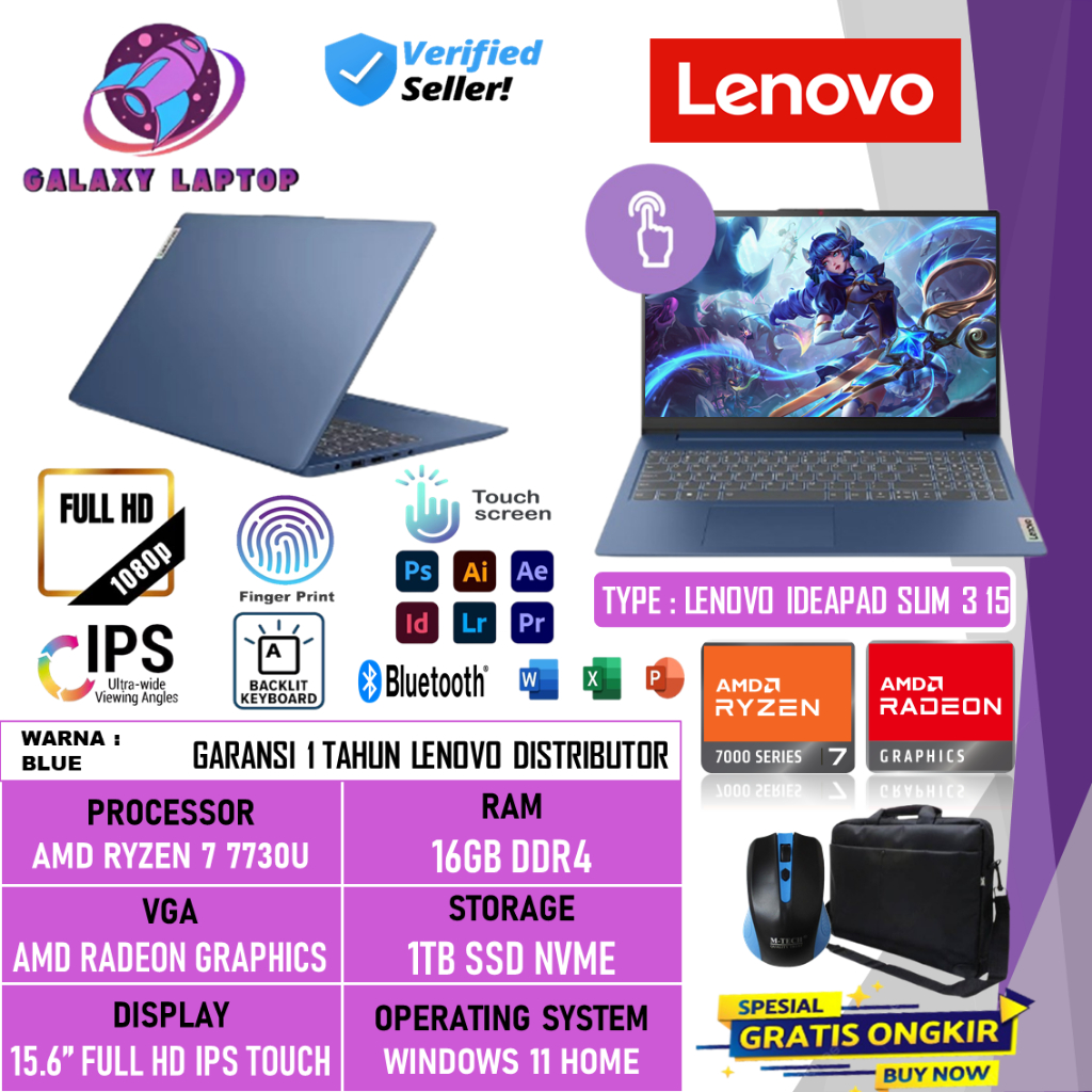 Laptop Touchscreen Lenovo Ideapad Slim 3 15 Amd Ryzen 7 7730U 16GB 1TB SSD 15.6 Inch FHD Win 11 Home