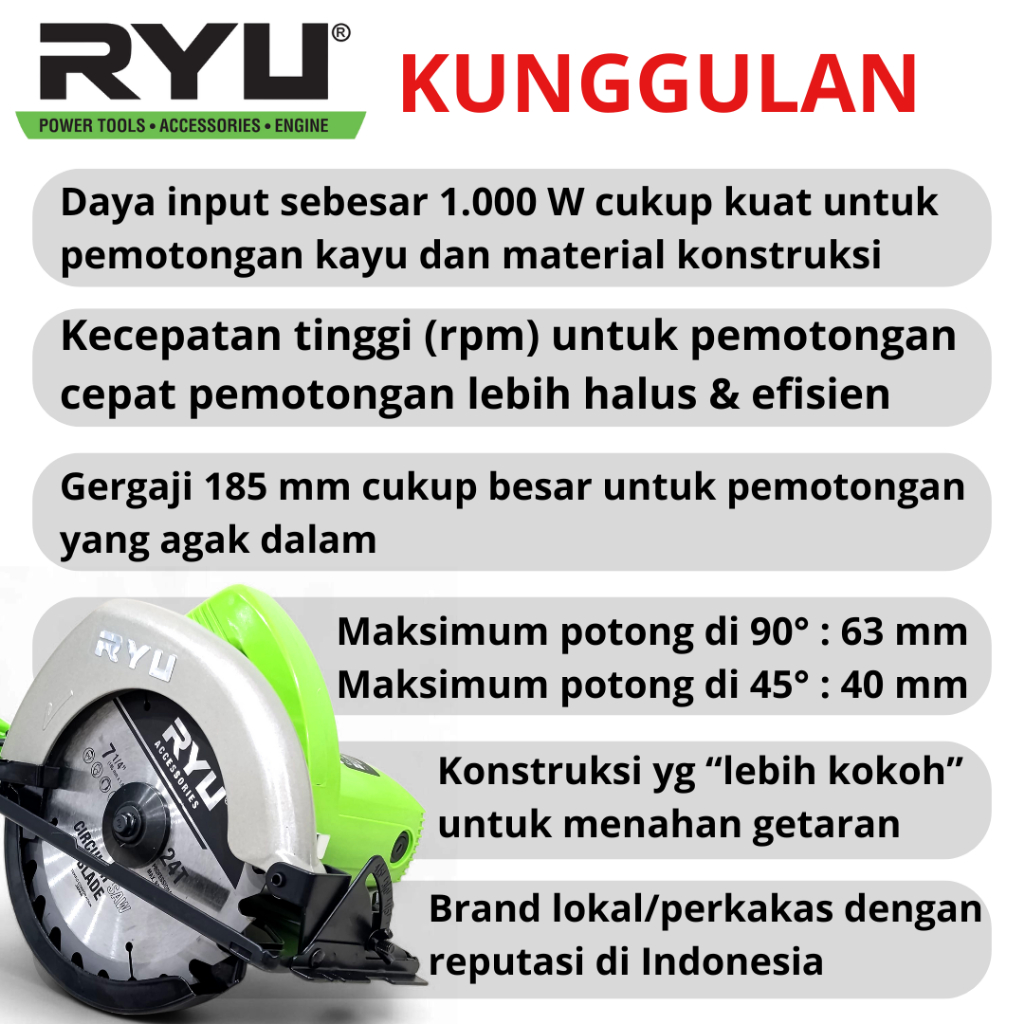 RYU Mesin Gergaji Circular Saw Potong Kayu 7 Inch RCS 185-1 Mesin Circle Sirkel Serkel SUPER TAJAM