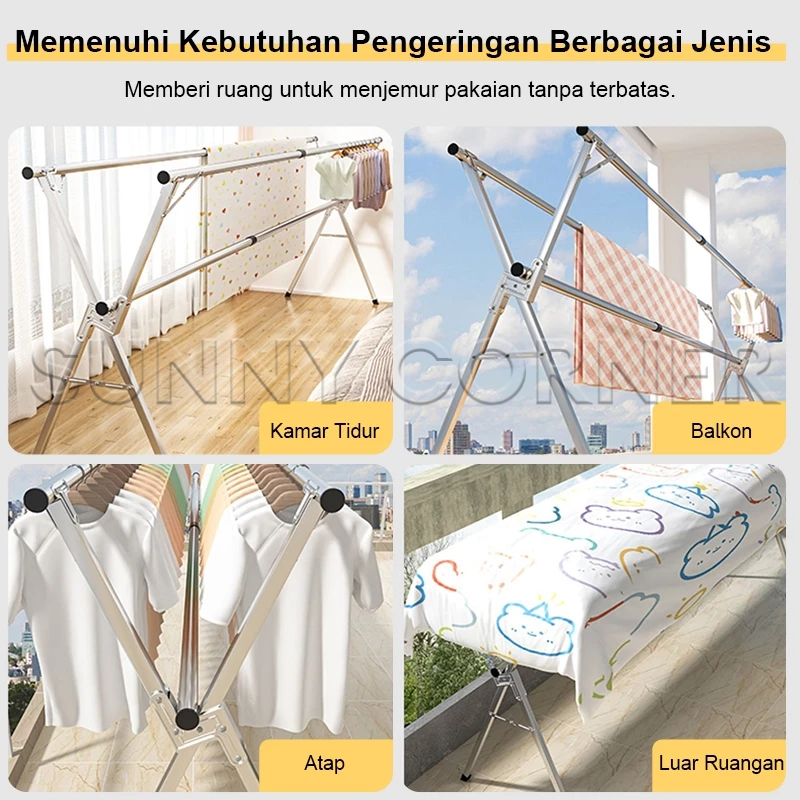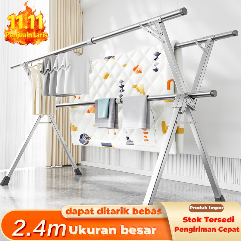SUS-304 Jemuran Baju Lipat Stainless Steel 2.4M Jemuran Pakaian Portable Basah Tahan Karat Outdoor/Indoor Jemuran Portable Lipat