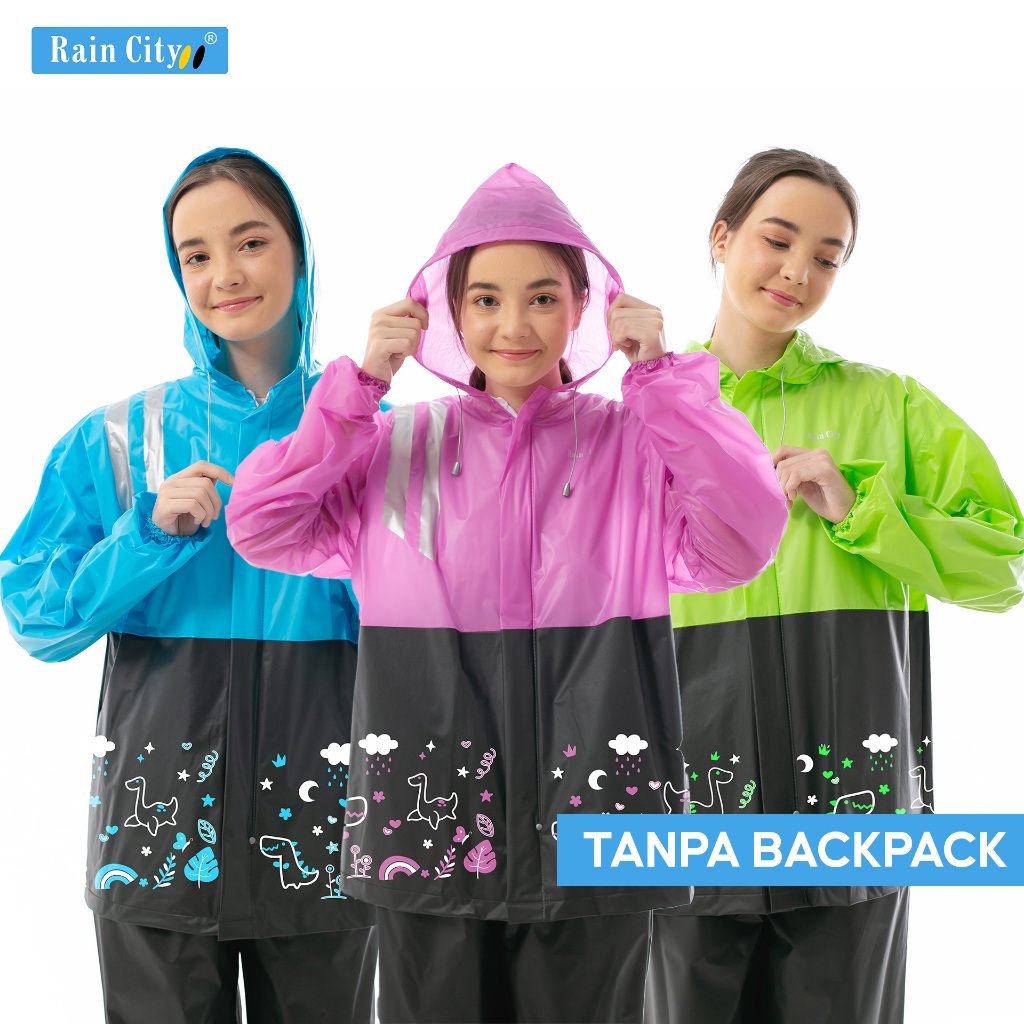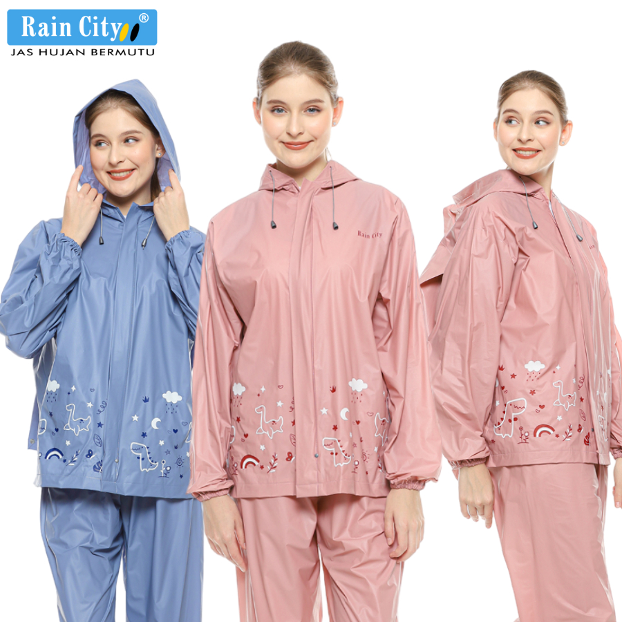 RAIN CITY Jas Hujan Setelan Wanita Ransel Pink Pastel Lucu Dino Doodle 70047 - PVC Anti Rembes
