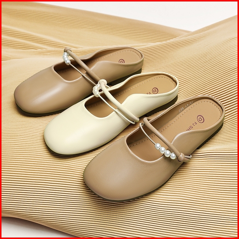 Ikunka Sepatu Flat Wanita Sandal Mules Slip On Kasual Jepang Sepatu Tunggal Kepala Bulat Datar