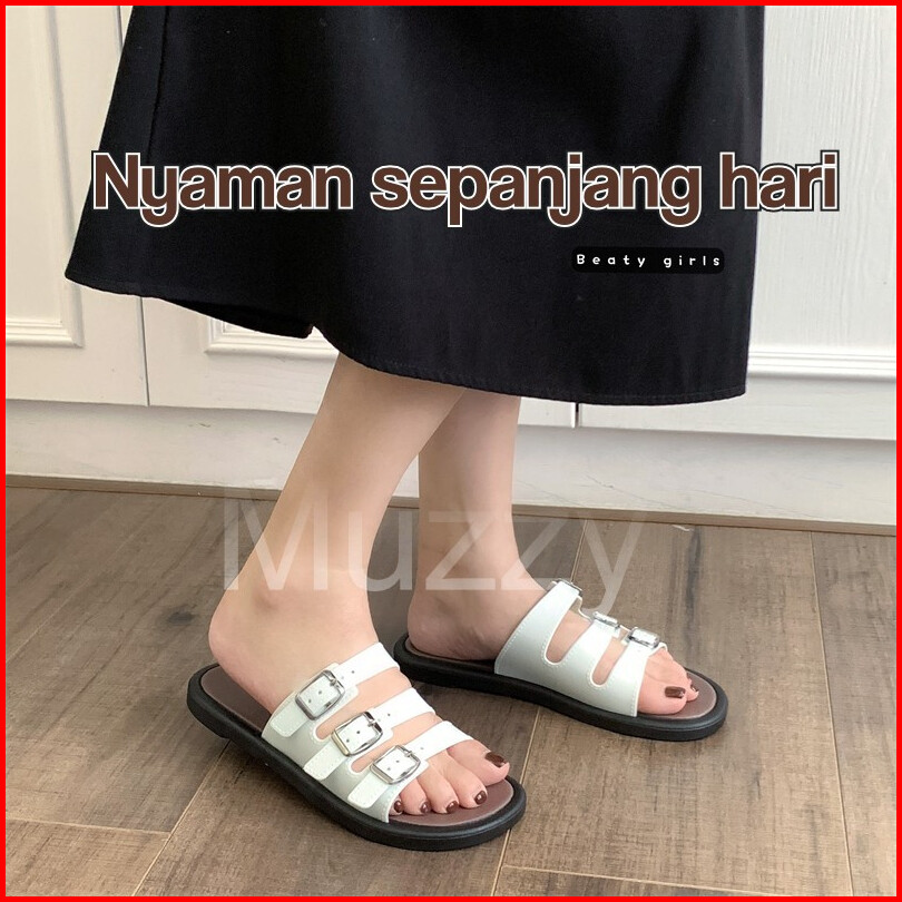 Muzy Sandal Flat Teplek Wanita Daily Casual Tali Strap Polos Kekinian Slop Elegan Anti Licin Hsn568
