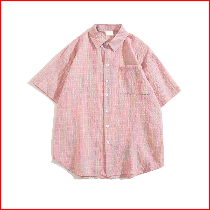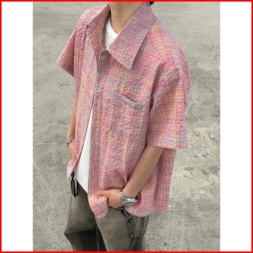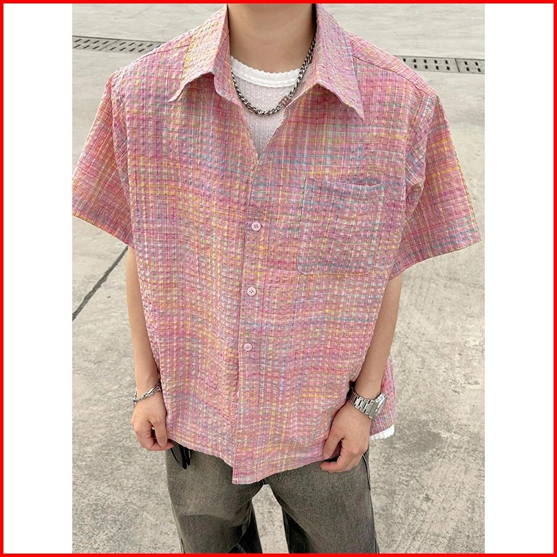 Dark Icon Pink Plaid Men S Shirts Short Sleeve Turn-down Collar Casual Shirts For Men
