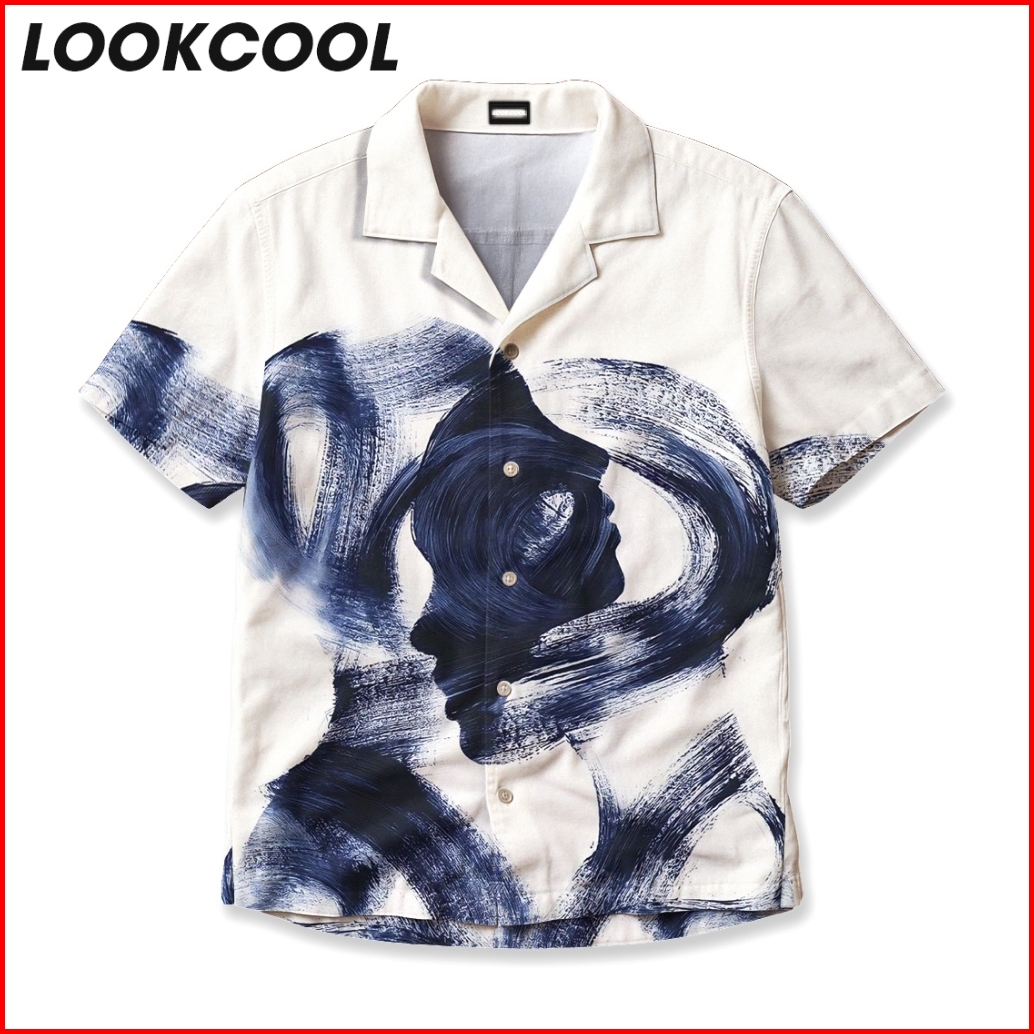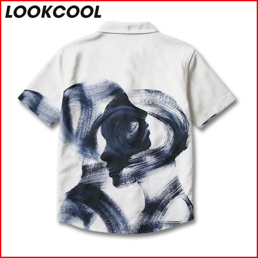 Lookcool Kemeja Putih Motif Lukisan Abstrak Sisi Profil Desain Unik Dan Artistik