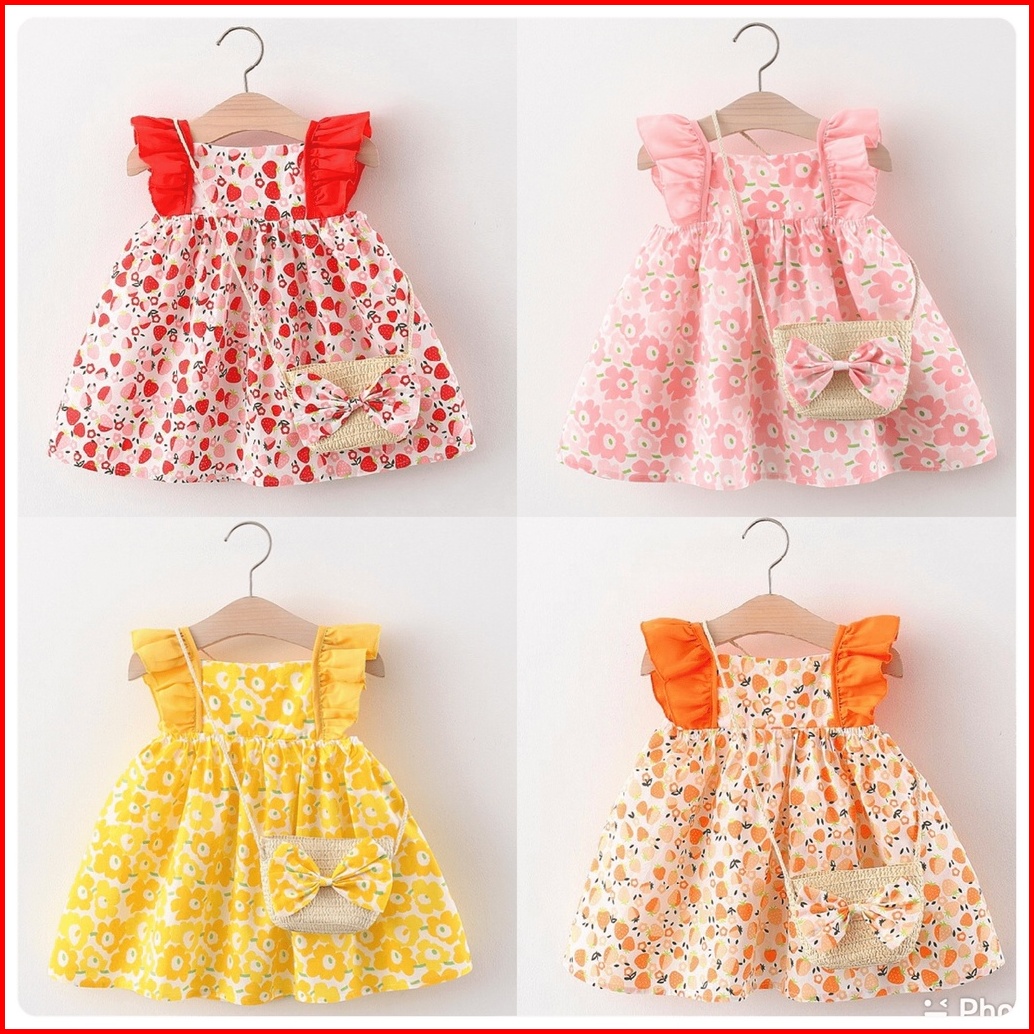 Incessbaby Gaun Baju Dress Anak Bayi Perempuan Cewek Import Korea Newborn Bunga Lebaran Natal Merah Kuning