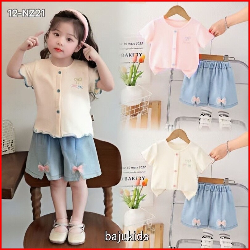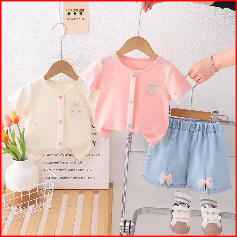 Setelan Baju Lengan Pendek Celana Jeans Pendek Asing Versi Korea Anak Perempuan Usia 1-4thn