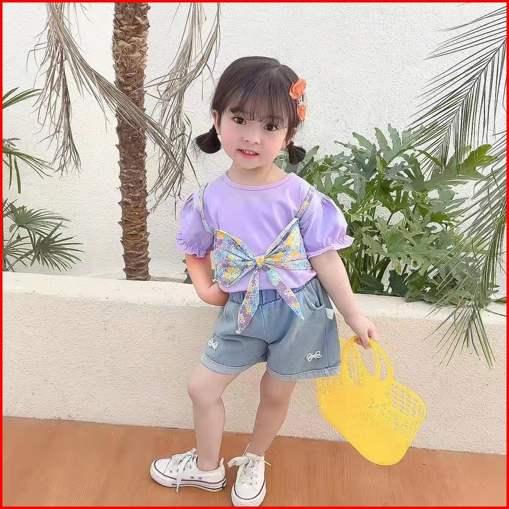 Setelan Anak Perempuan Impor Set Anak Cewek Lucu Kaos Celana Jeans Pendek Premium Usia 1-5thuan
