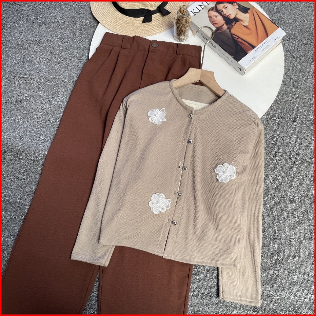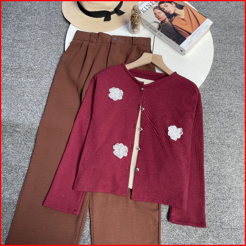 Violine Store - Oneset Setelan Wanita Kekinian Cardigan Knit Crop Bunga Mix Celana Kulot Crinkle Airflow Outfit Wanita S