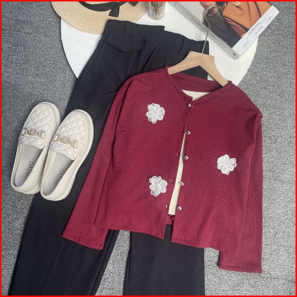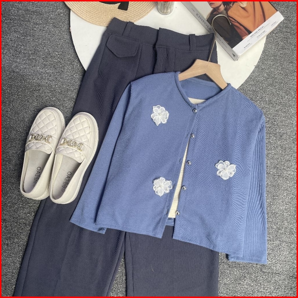 Violine Store- Oneset Setelan Wanita Kekinian Cardigan Knit Crop Pita Satu Kancing Celana Knit Outfit Wanita Setelan Rem
