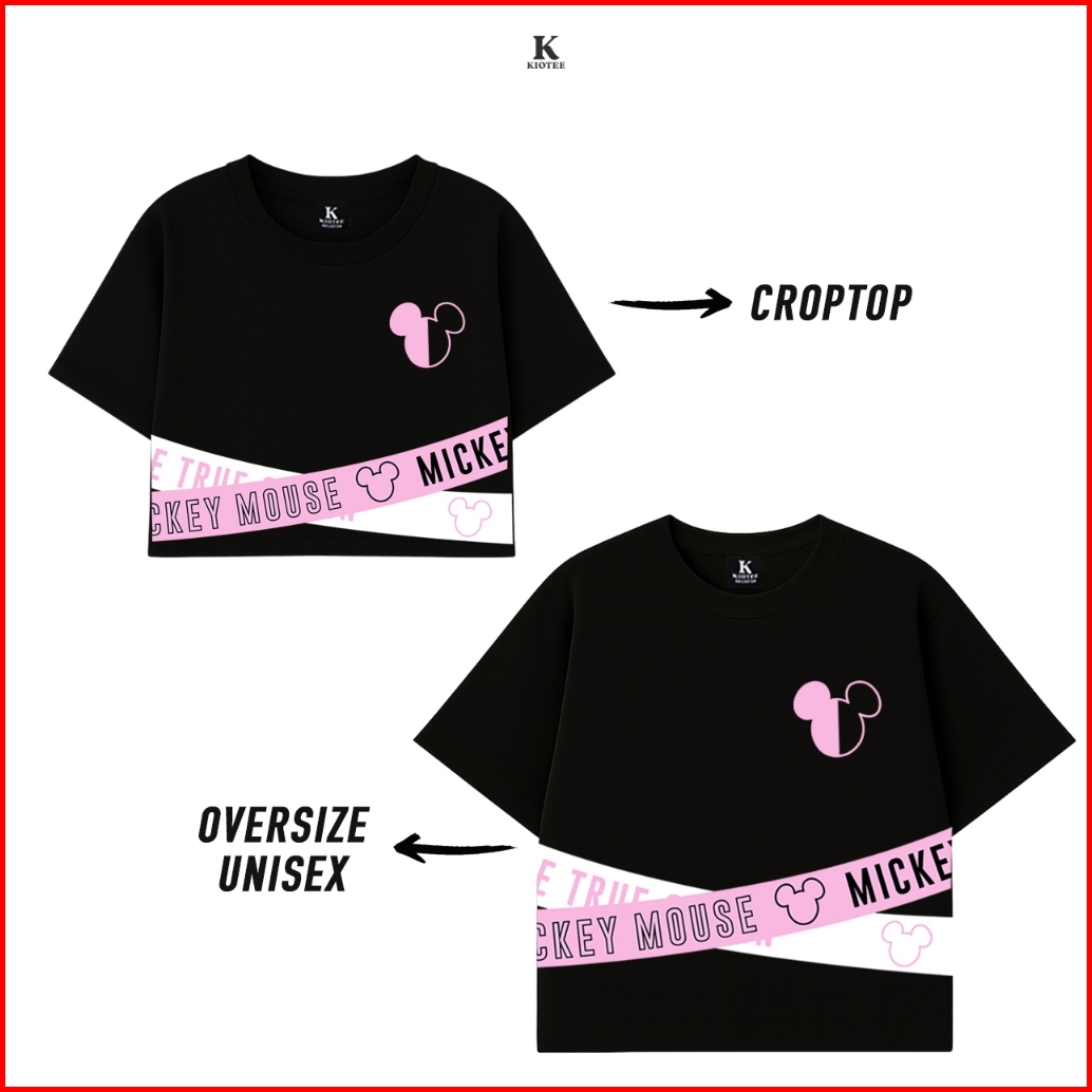 Kioteeshop Baju Kaos Cewek Croptop Oversize Lengan Pendek Gambar Mickey Mkgarispink